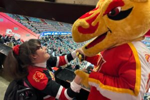 One of the coolest parts of the game was meeting Blasty, the team’s mascot. Blasty was super friendly, and it made the whole experience even better. Being there, surrounded by all the excitement and action, made me think about all the great memories I have from playing volt hockey and power chair hockey. Both of those sports have given me so many fun moments and helped me fall in love with hockey even more.
